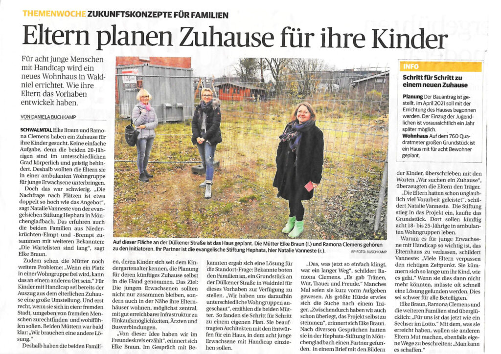 Mit der Evangelischen Stiftung Hephata haben wir einen sehr kompetenten und engagierten Träger gefunden, der mit dem Bau des Wohnhauses in Waldniel bereits im April 2021 begonnen hatte und unsere Wohngruppe seit Juli 2022 betreut.